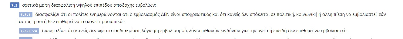 7.3.1 διασφαλίζει ότι οι πολίτες ενημερώνονται ότι ο εμβολιασμός ΔΕΝ είναι υποχρεωτικός και ότι κανείς δεν πιέζεται πολιτικά, κοινωνικά ή με άλλο τρόπο να εμβολιαστεί, εάν δεν το επιθυμεί.